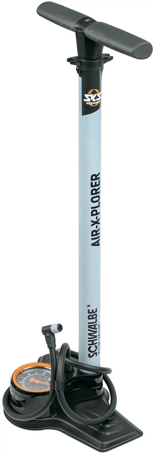 Padlópumpa SKS CLIK TEC pumpafejjel SKS/Schwalbe kialakítású levegőteljesítmény: A jól bevált AIR-X-PLORER egyedi megjelenésű és SKS CLIK TEC szelepfejjel van felszerelve. Ez könnyen, hallható kattanással rögzíthető az új Schwalbe Clik szelephez. A pumpa további jellemzői közé tartozik a nagyméretű precíziós nyomásmérő, a masszív tartócső és az ergonomikus kialakítású fogantyú. A gumírozott kerékpárpumpa fej könnyedén, mindössze két ujjal működtethető, és a pumpálás gyerekjátékká válik! A szelep eltávolításakor jelentkező kopás és nyomásveszteség jelei a múlté, és a térfogatáram is 50%-kal magasabb, mint a Presta szelepek esetében. Az SKS állópumpa két szelepbetéttel rendelkezik a Presta és Dunlop szelepek utólagos felszereléséhez. 2 szelepbetét Presta 2 szelepbetét Dunlop szelep 1 szelepszerszám 4 porvédő sapka